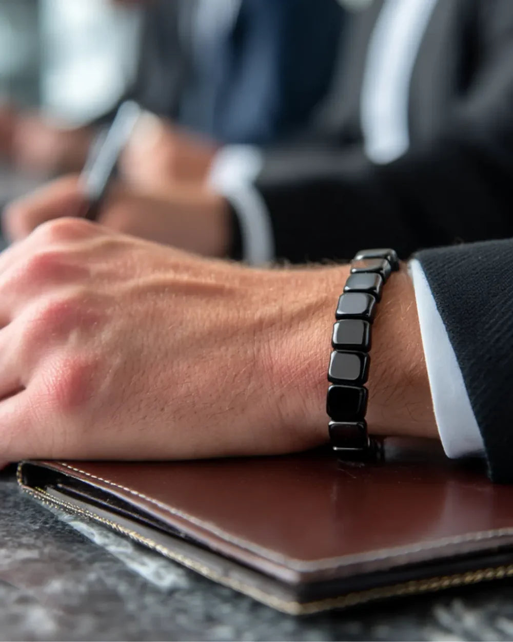 Ja. De Hemios-armband heeft een sterke, rekbare kern die zich aanpast aan vrijwel elke polsmaat, terwijl hij stevig en mannelijk blijft zitten.