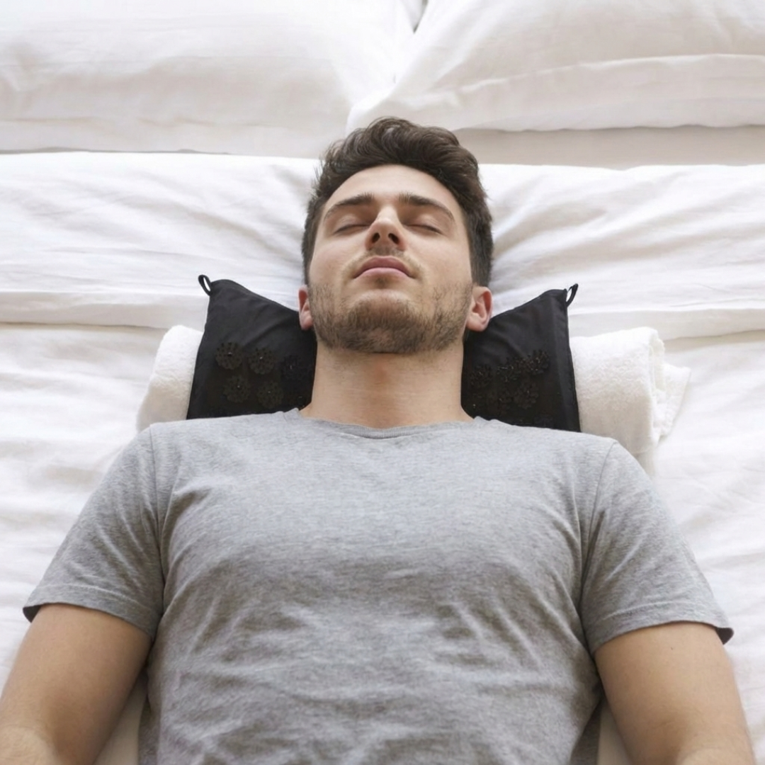 De zorgvuldig geplaatste acupressuurpunten stimuleren je lichaam om spanning los te laten en tot rust te komen — je hoeft alleen te gaan liggen en te ademen.